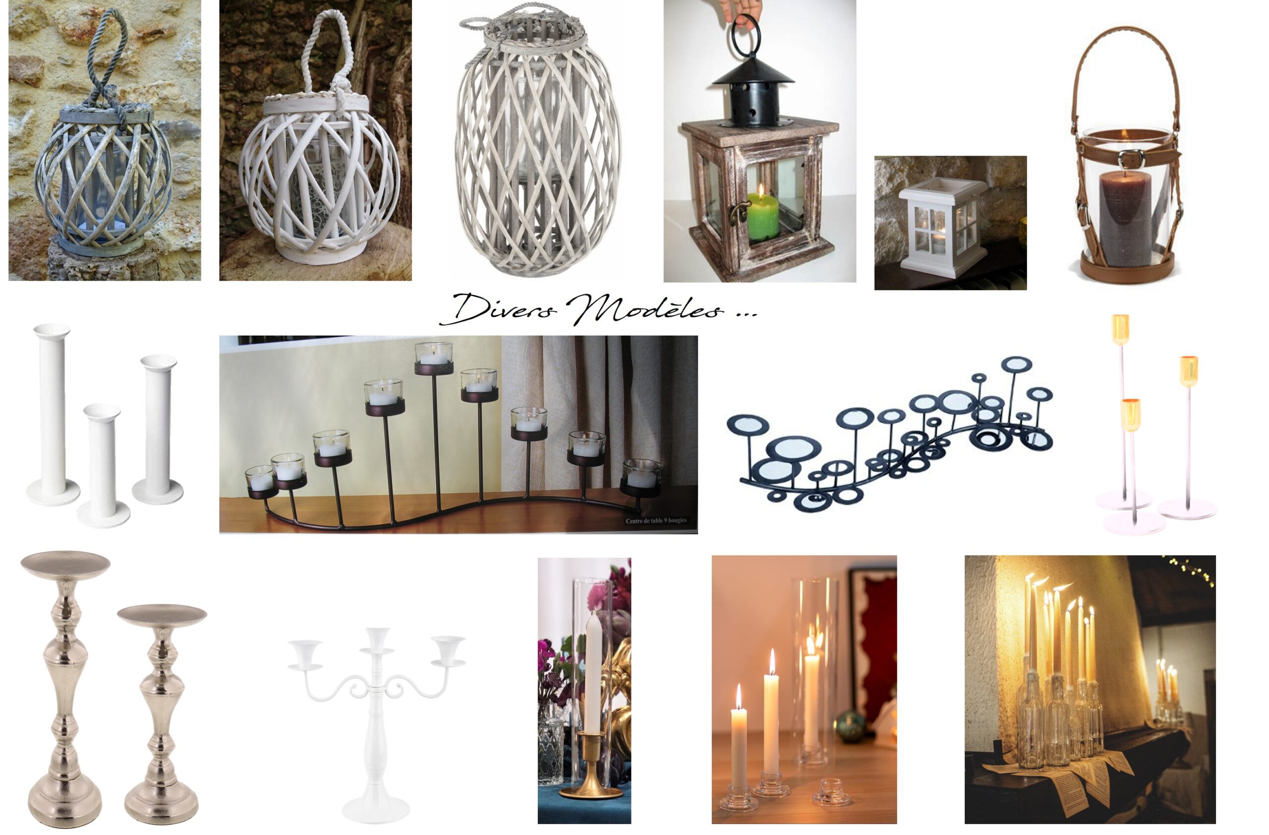 Divers modèles de lanternes et bougeoirs sont à votre disposition pour illuminer votre réception et créer une ambiance du plus chaleureux.